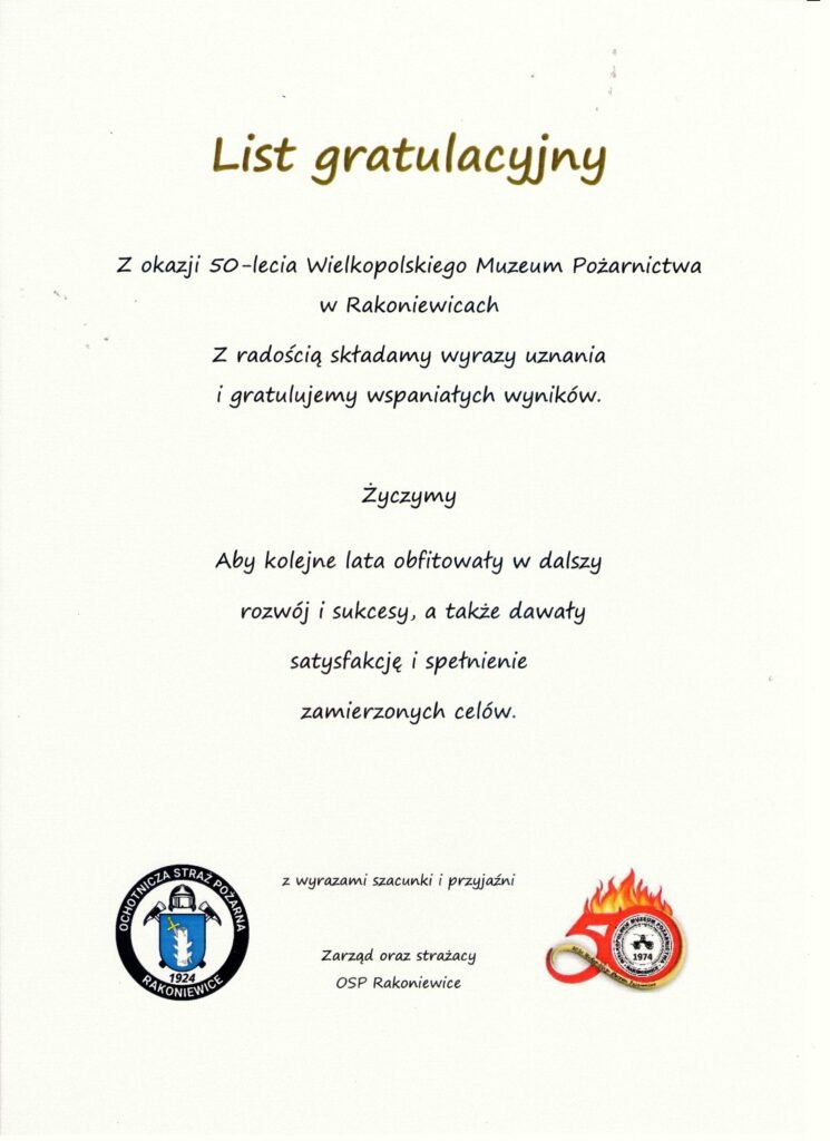 1 czerwca 2024 roku na rynku w Rakoniewicach odbyły się uroczystości z okazji Wielkopolskich Wojewódzkich Obchodów Dnia Strażaka połączonych z Jubileuszem 50-lecia Wielkopolskiego Muzeum Pożarnictwa w Rakoniewicach.